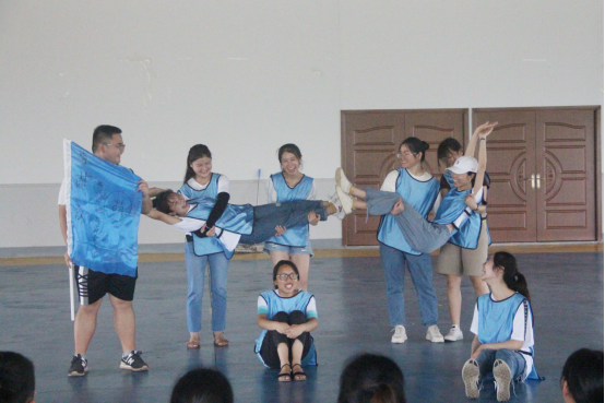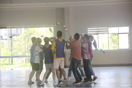 四支队伍通过彼此的配合与协作,完成“逢七过”报数游戏、矿泉水接力等四个游戏,用时最少的队伍获胜。