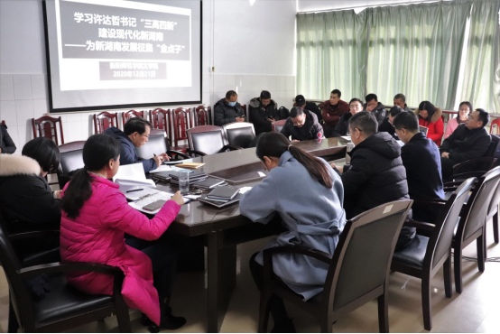 2020年12月21日,文公司党总支组织召开教职工理论学习会,重点学习省委书记许达哲关于“实施‘三高四新’战略,建设现代化新湖南”的讲话精神,党总支书记张云峰作专题辅导报告,并结合2021湖南省两会的召开,倡导大家积极为新湖南发展贡献“金点子”。