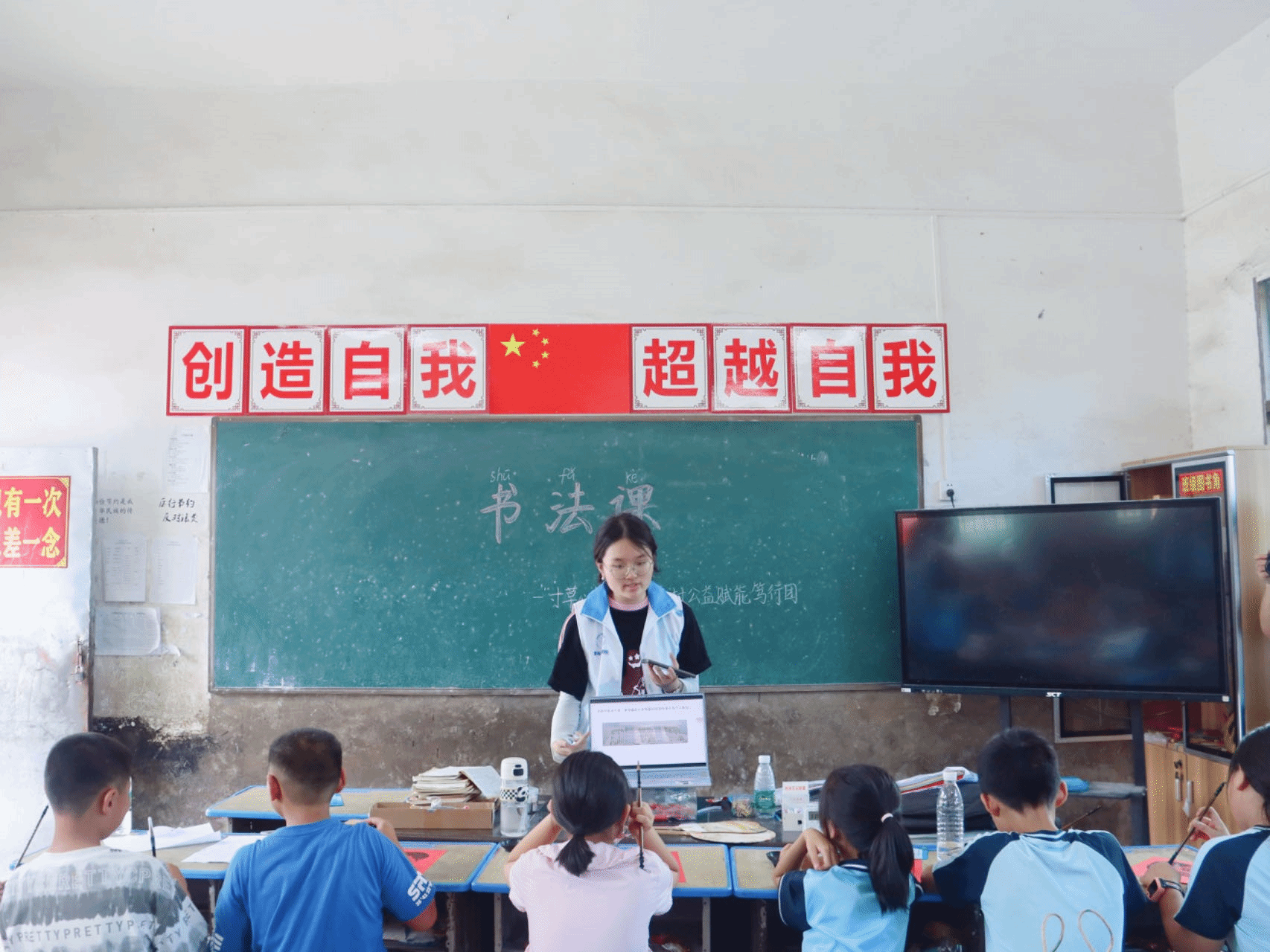 志愿者带领孩子们学习书法