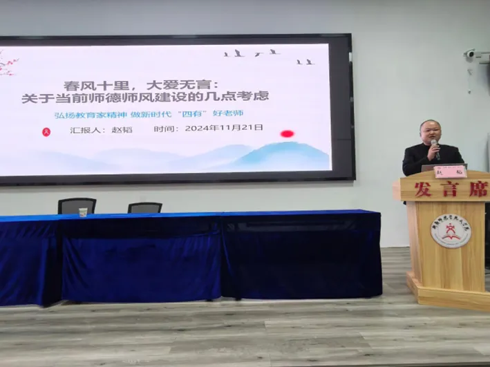 而后,赵韬带领大家学习了新时代总书记对师德的论述,并大力提倡弘扬教育家精神,做新时代“四有”好老师。他通过真实感人的教育故事,展现了师德的力量。