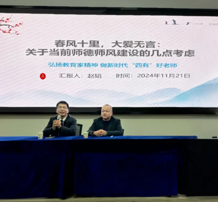 讲座过程中,赵韬结合自己丰富的教育经验和深刻的教育思考,从新时代教育背景下的师德内涵、教师角色定位、师生关系构建以及教师个人成长等多个维度,深入浅出地探讨如何成为一名既有仁爱之心又有高尚师德的人民教师。