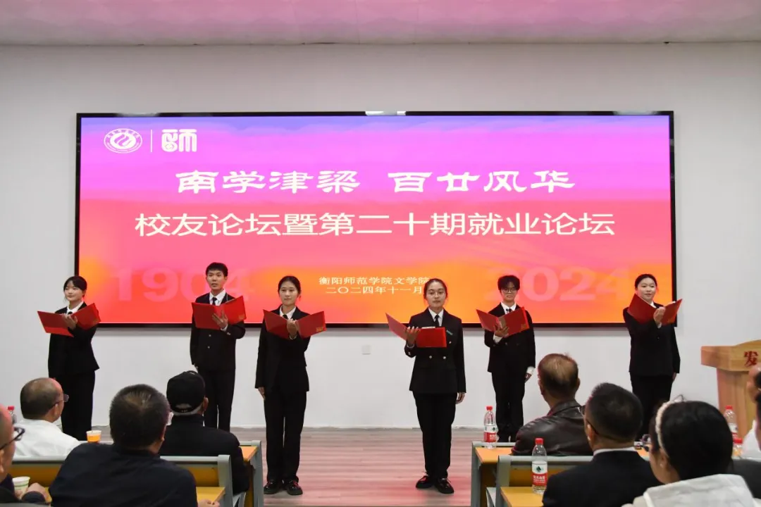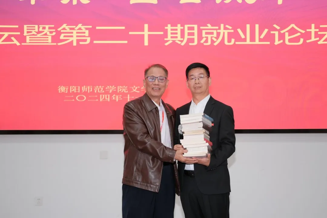 会上,孙文愿勉励在场青年学子们作为师范生应时刻铭记“学为人师、身正为范”的宗旨,并衷心祝愿同学们在未来步入职业后于各个行业发光发热;朱维德带领现场师生再度体悟《岳阳楼记》的风骚,在激昂的诗句中感受语言经典,点燃了学子们学习中华经典的热情;2017级员工戚怀月由衷地向衡师学子表达祝福,她以人民日报金句“跑起来就会有风”为勉励语,鼓舞学弟学妹们踏踏实实走好每一步路。为感恩母校多年的谆谆教诲,郭玉堂为公司文星计划注入资金支持;黎跃进则以捐赠书籍的形式为了文院学子注入精神源泉。