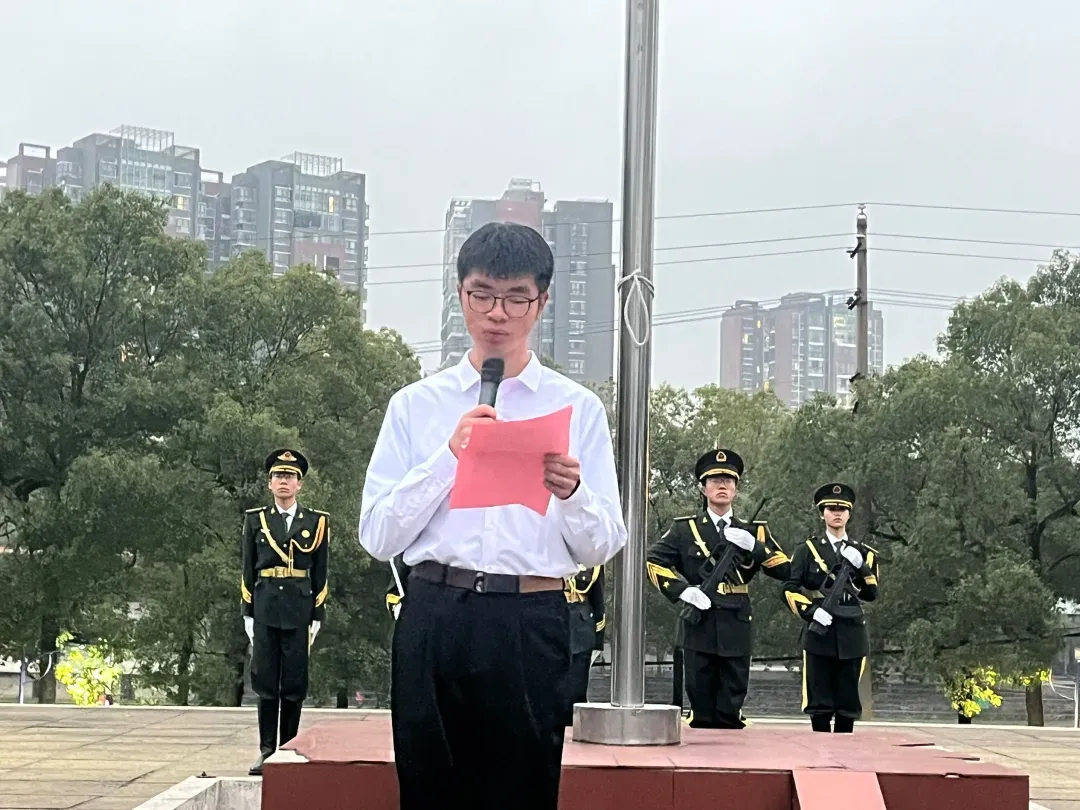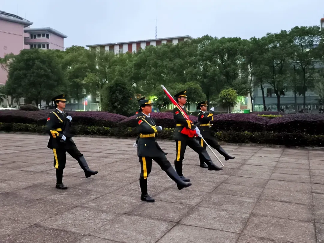音乐一响,全场肃静。“护迎国旗”指令一出,教导队迈着整齐有力的步伐,昂首挺胸向国旗台走去,他们的每一个动作都彰显着军人般的严谨庄重,仿佛诉说着青年的力量与担当。