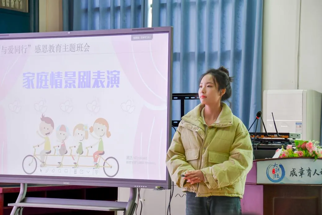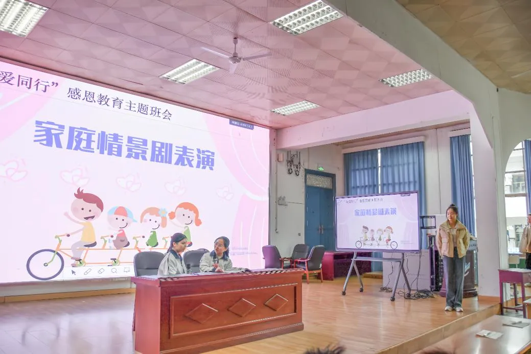 曹丹老师“与爱同行”感恩主题班会温情满满。家庭情景剧揭开序幕,亲子吐槽大会袒露心声,它们于真实分享中打破了亲子“屏障”。而视频《妈妈的不易》触动心弦,朗诵诠释爱的细节,宣誓铿锵表志,于青春心田种下感恩种子,让爱在点滴中不再含蓄,温暖流淌在教室每个角落。