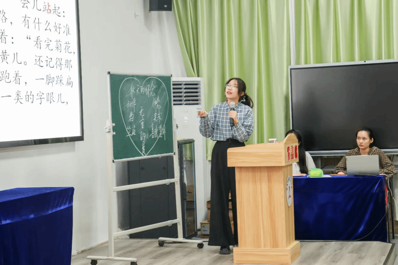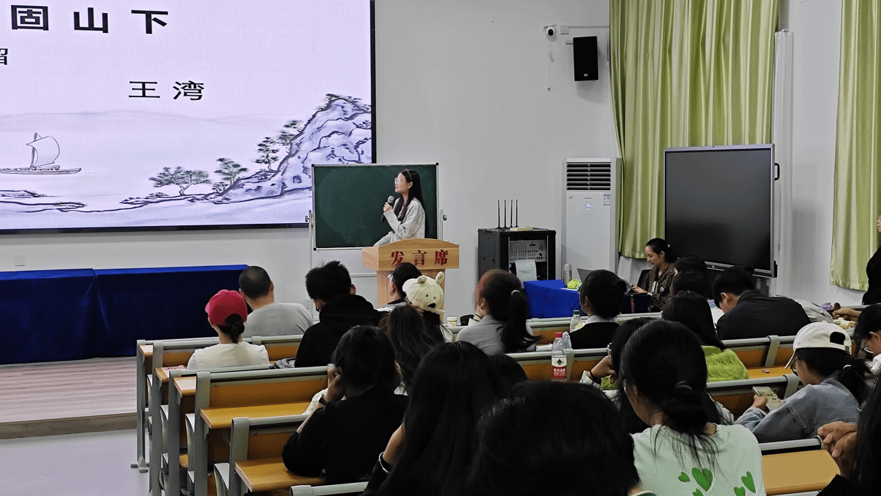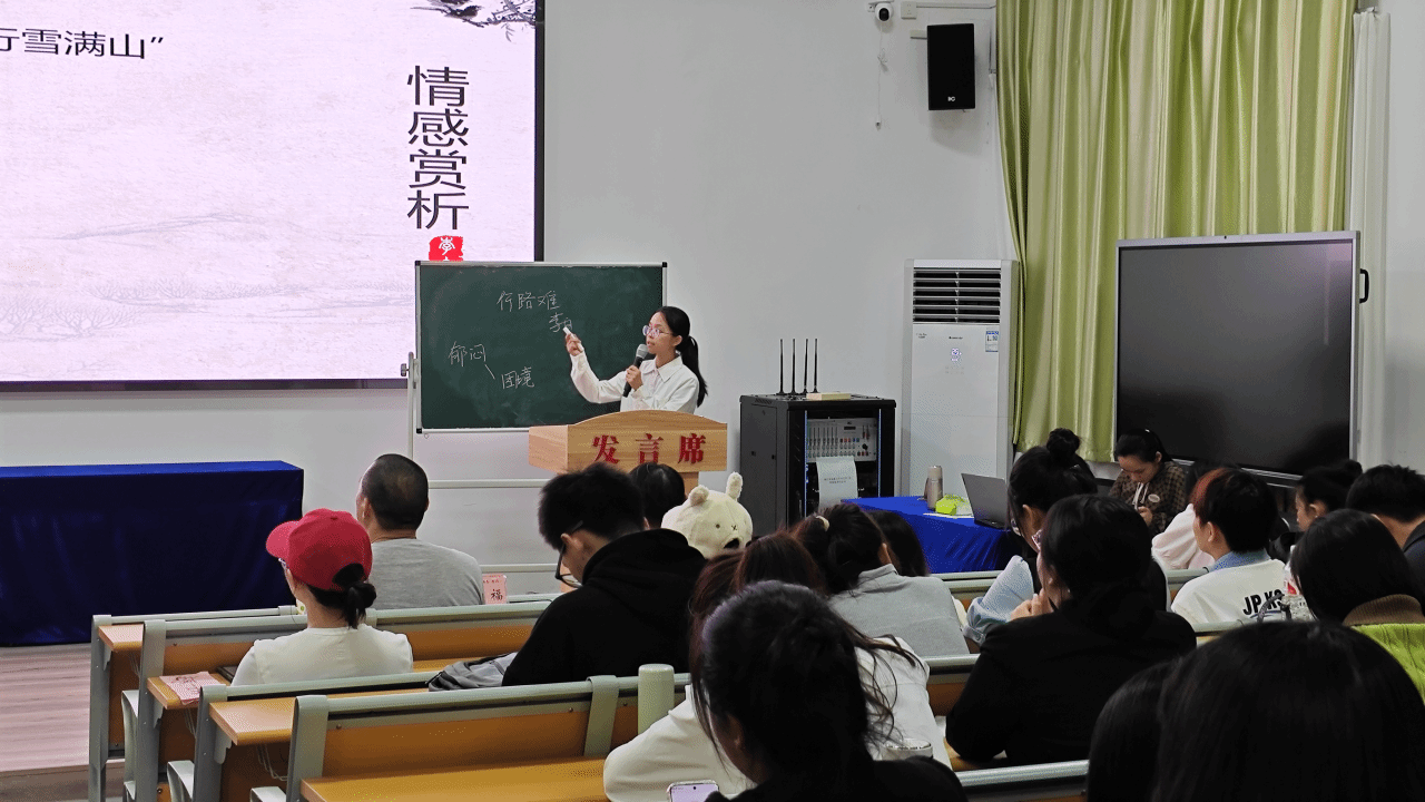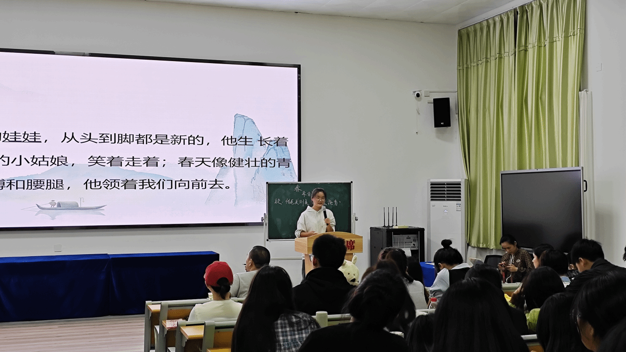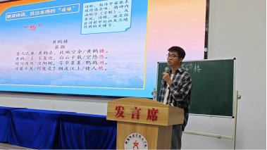 选手展示环节。未来的老师们奋力耕织着语文教育的壮美画卷,他们绘声绘色,各有千秋,为众人带来一场沉浸式的视听教学盛宴。他们于讲台上激烈角逐,以自己的特色讲解不同主题下的文章和诗歌,似时而有潺潺细流从耳边淌过,时而响起抑扬顿挫的美妙旋律,时而又充斥着洪亮清晰的字句碰撞声......选手们声情并茂,将气氛逐渐推向了高潮,他们的身影显现出了未来教师的光彩风貌。
