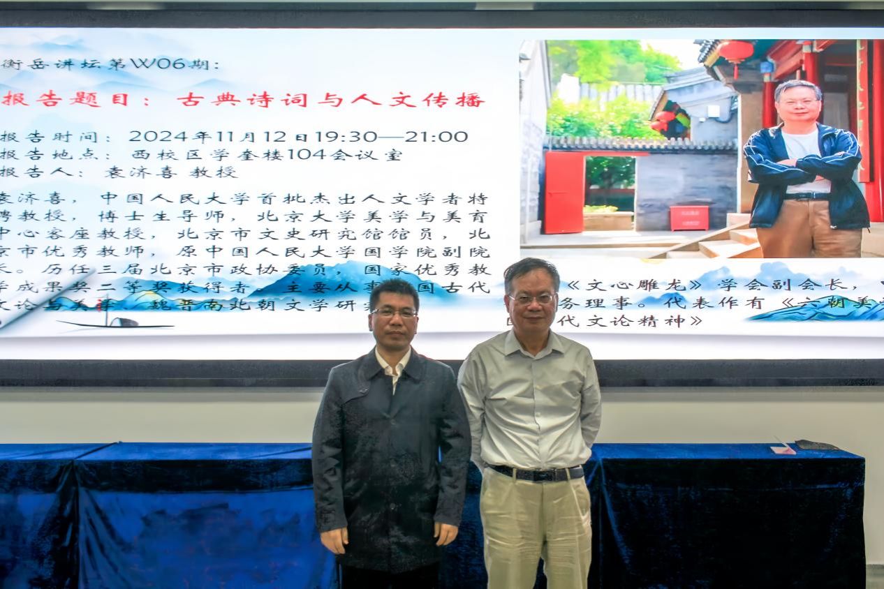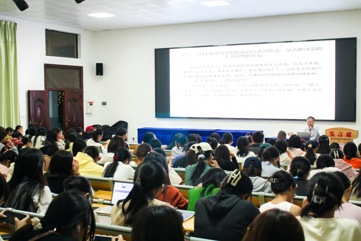 为充分调动员工对古典诗词的兴趣,提高员工在人文传播方面的鉴赏能力,让他们进一步体会到中华古典诗词的深刻内涵,11月12日晚,衡岳讲坛第W06期主题讲座于学奎楼104玉振堂开展,中国人民大学特聘教授袁济喜为主讲人。乐天使经理任美衡和教师秦秋咀出席本次活动,乐天使员工代表到场参与。