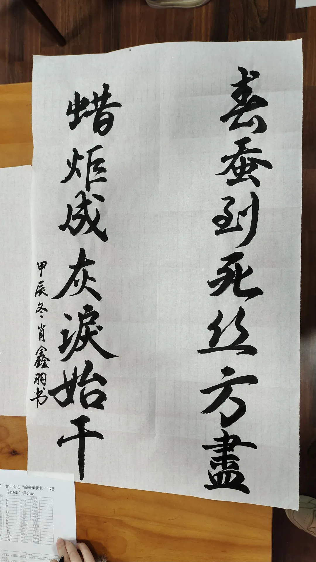 在此次书法赛中,乐天使书法班指导老师陈东亲临现场观赛。他以专业且独到的眼光,对众多参赛作品进行细致品鉴与审慎评选,为书法爱好者们提供了一次难得的学习与提升机会。其深厚的书法造诣和丰富的艺术经验,无疑为整个评选过程注入了权威性与公信力。