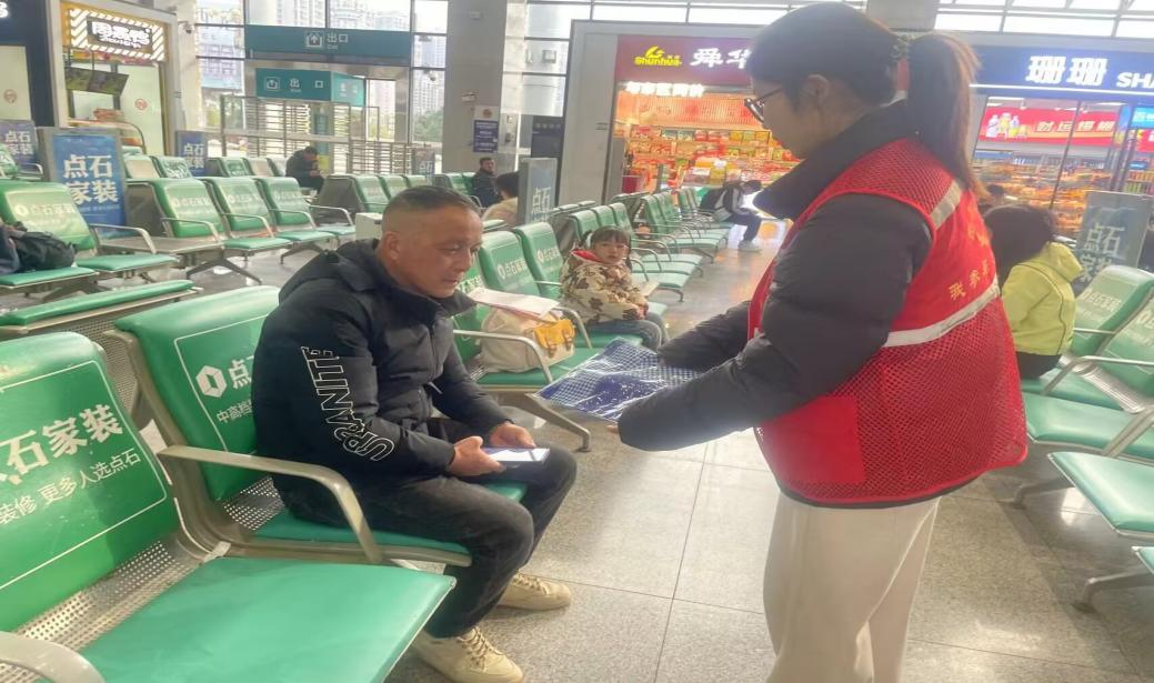 在候车区,志愿者们还开展了安全知识小讲堂。他们拿着精心准备的宣传手册,向旅客们普及高铁乘车禁止携带的物品、紧急情况下的应对措施等安全知识。通过生动的案例和通俗易懂的讲解,让旅客们在轻松的氛围中提高安全意识。一位大爷听了志愿者的讲解后,感慨地说:“以前还真不知道有些东西不能带上高铁,多亏你们讲得清楚,不然我这一趟可就麻烦咯!”同时志愿者们还录制了出行安全祝福。
