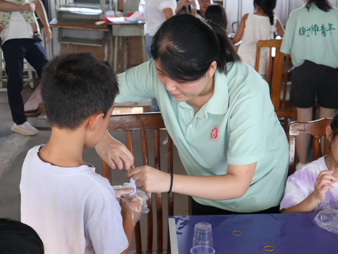 7月11日上午,来自乐天使“寸草心计划”——春晖育苗乡村振兴实践服务团,于上午九点准时与留守儿童相聚在郴州市永兴县悦来镇鸦鹊村的“玩美伙伴”图书馆内,开展了一堂别开生面的非物质遗产扎染手工课。活动旨在将传统非遗文化引入乡村儿童生活,丰富孩子们的暑期精神世界,提高实践动手能力与审美意识。
