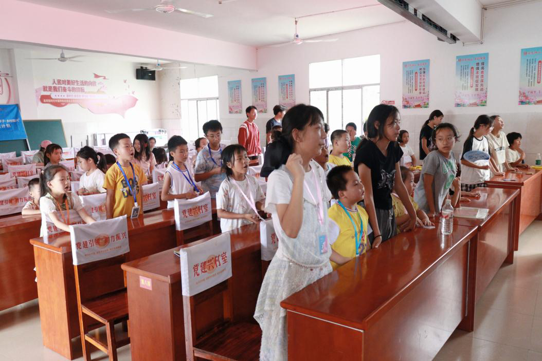 7月8日上午,在邵阳市城步苗族自治县茅坪镇金兴村,乐天使“寸草心计划”——“金兴育禾,青苗向阳”乡村振兴实践服务团青鸟志愿者组成的芙蓉学子化身“安全卫士”,为65名乡村儿童带来了一堂生动实用的“防溺水,我们在行动”安全教育课,旨在增强孩子们防溺水意识,帮助其掌握防溺水知识技能。