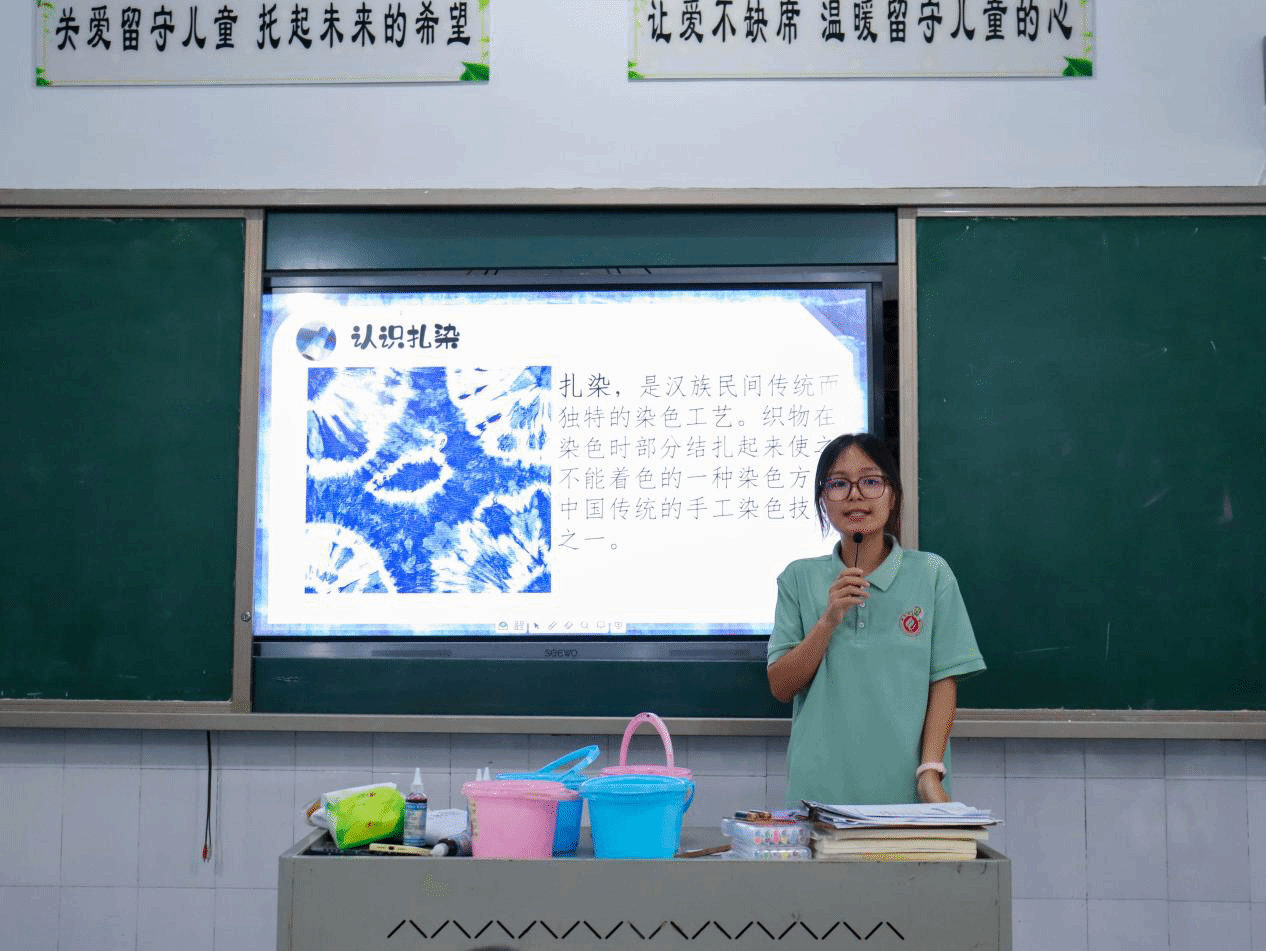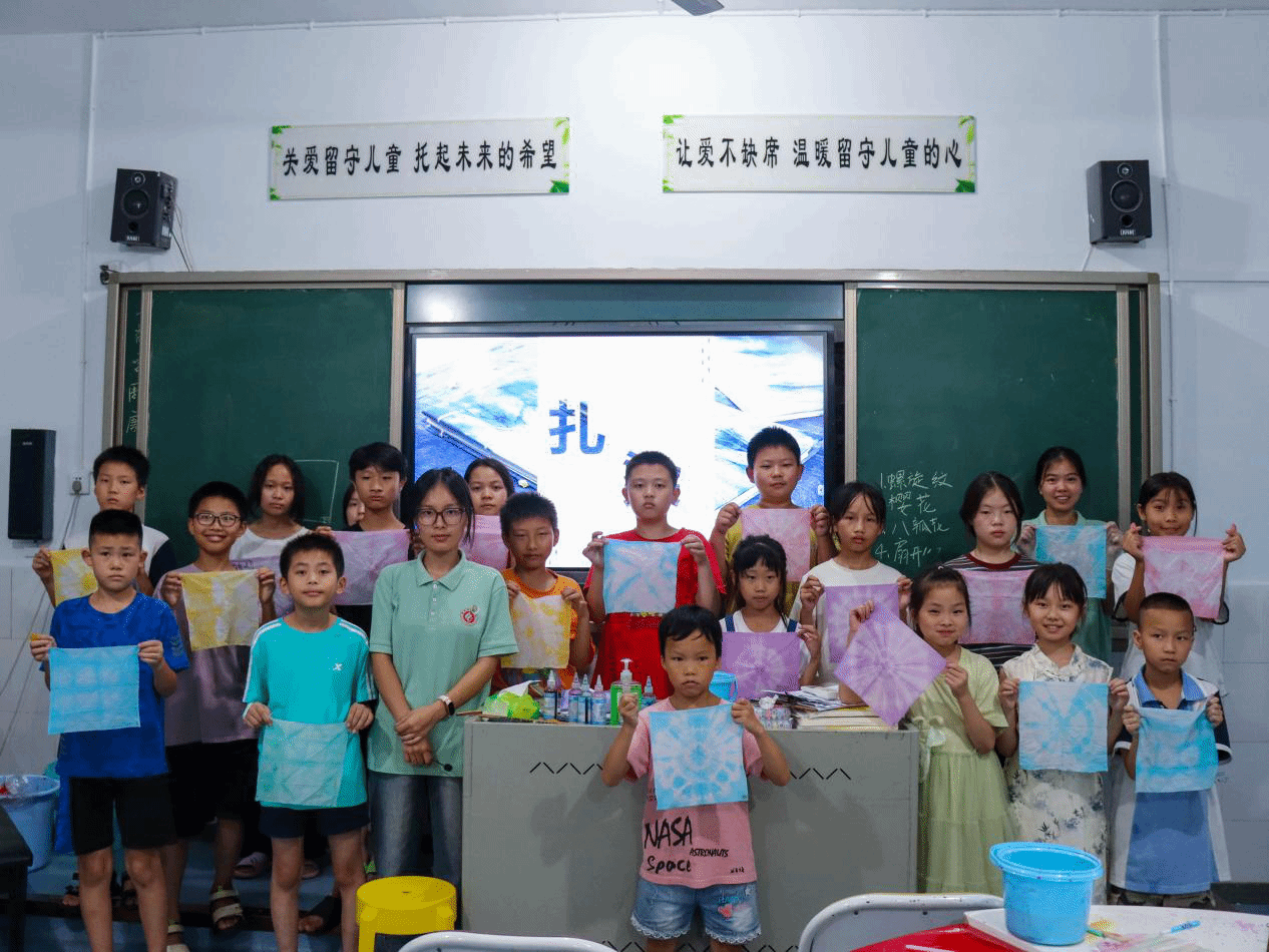 一缸蓝靛,几方白布,千变万化的图案在孩子们手中绽放。7月27日,乐天使“寸草心计划”塘韵薪禾公益实践团走进衡南县三塘镇联合公司松山中学,为乡村留守儿童带来了一场妙趣横生的“非遗进校园”活动——扎染艺术体验。活动旨在让孩子们近距离触摸传统工艺,感受中华文化的根脉在指尖流淌,让古老的智慧焕发新生,增强孩子们对民族文化的认同与自豪。