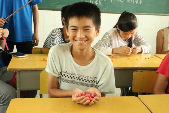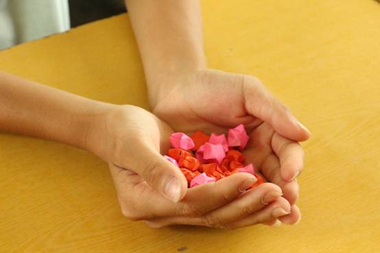 她叫谢敏,12岁。一进教室我们就发现了这个有些“高冷”的小女孩。一开始,面对团队成员问她的名字,她都不愿意回答。但在折纸的游戏中,她却将自己的星星送给了我们。