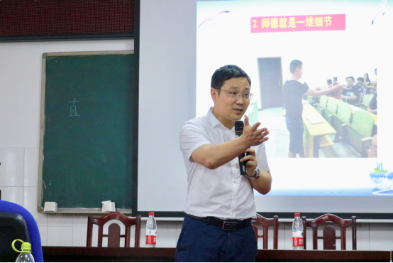 接着,对于“为什么要提高师德素养”这一问题,黄佑生老师列出三点原因:一是党和国家的时代召唤,二是教育的本质要求,三是教师完善自我的需要。“有德无才当不好老师,有才无德不能当老师。因此,加强师德师风建设刻不容缓。”黄佑生老师再次强调德才兼备的重要性。“教,上所施下所效也;育,养子使作善也。教师的天职是育人教书,身教言传。”黄佑生老师如此解释教育的本质。他认为,教育的目的是让幸福的人培养更幸福的人,让优秀的人培养更优秀的人。