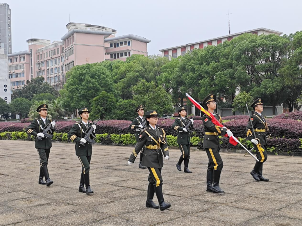 国旗护卫队昂首挺胸、目光如炬,迈着整齐划一、铿锵有力的步伐稳步前进,庄严肃穆地将五星红旗交给升旗手。