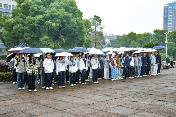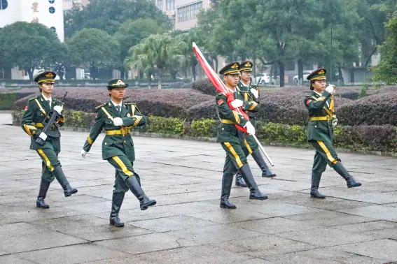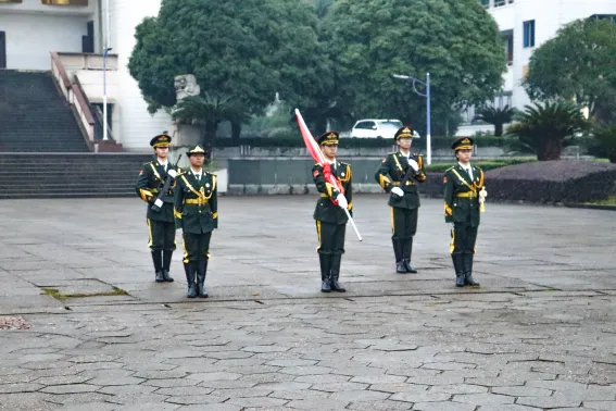 音乐一响,全场肃静。“护迎国旗”指令一出,教导队迈着整齐有力的步伐,昂首挺胸向国旗台走去。他们的每一个动作都彰显着军人般的严谨庄重,仿佛诉说着青年的力量与担当。