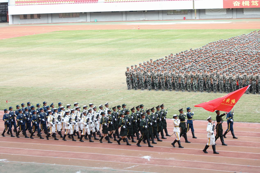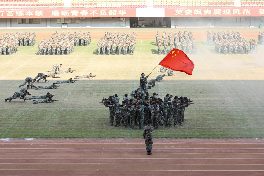 随后分列式方阵的同学迈着整齐的步伐,昂首阔步依次从主席台前经过,“听党指挥,能打胜仗,作风优良”,口号声如洪钟敲响,震耳欲聋。“利刃出鞘,所向披靡”由女生组成的匕首操方阵,她们的每一个动作都强劲有力,每一声呐喊都振奋人心,极有巾帼不让须眉之势。“黄沙百战穿金甲,不破楼兰终不还”拳操方阵整装待发,他们气宇轩昂,雄姿英发,一招一式、一拳一脚,颇有沙场秋点兵之气势。反恐表演更是将军训汇报表演推向高潮,“救援兵”与“恐怖分子”一系列打斗动作惟妙惟肖,让人身临其境,僵持阶段所发射的“炮弹”一举拿下“窝点”,取得完全胜利,赢得了全场观众雷动的掌声。