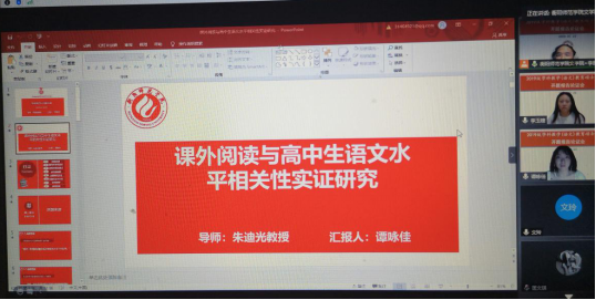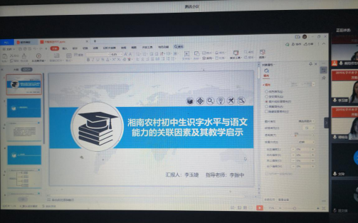 由于疫情原因,本次报告论证会通过腾讯会议在线上开展,参与本次会议的有:外请专家湖南师范大学学科教学(语文)学科负责人、教授张良田,衡阳市八中董事长、语文中教正高教师文思源,衡阳市八中语文中教高级教师李自生;硕士研究生导师任美衡、李振中、朱迪光、左其福,研究生秘书文玲;2019级研究生谭咏佳、陈瑶和李玉婕,以及2020级学科教学(语文)教育硕士部分研究生新生。报告会由乐天使主管副经理李振中主持。
