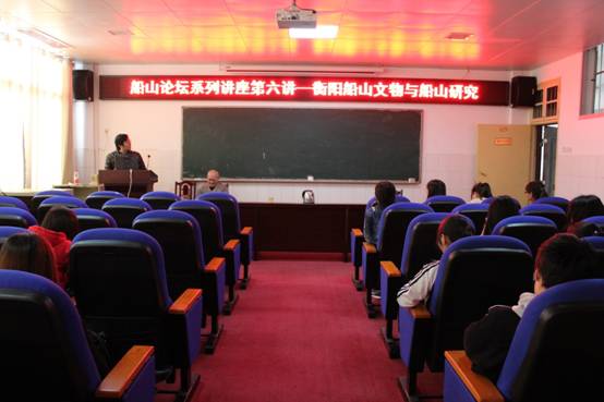 肖教授从“双鹤瑞舞赋”、“莫氏藏稿”等多件同王船山相关或是王船山遗留的历史文物来龙去脉文化内涵说起,旁征博引,带领同学们领略伟大文学家、思想家王船山的余风遗韵。针对有关王船山某些有争议性的文物,肖教授提出了自己独到的见解,引发同学们的进一步思考。李教授说,虽然历史的原貌我们今人无法看到,但通过文物去挖掘其内涵,对当下弘扬衡阳地方文化,弘扬王船山辩证唯物主义思想具有不可磨灭的作用。