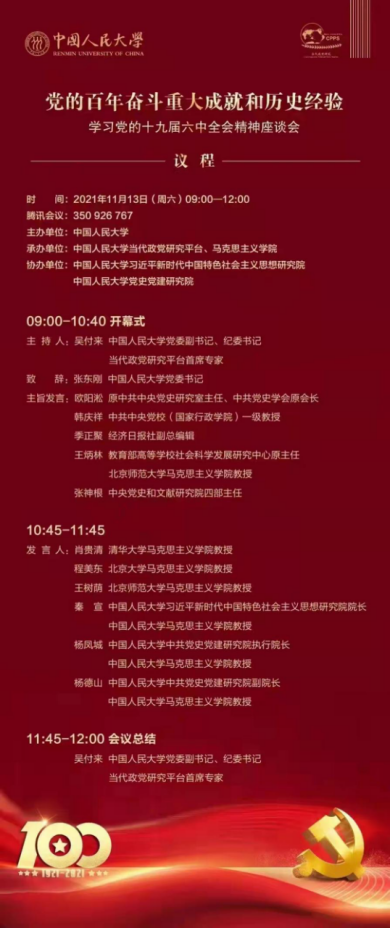 2021年11月13日9:00——12:00,由中国人民大学主办的“党的百年奋斗重大成就和历史经验——学习党的十九届六中全会精神座谈会”在北京举行,公司党总支第一时间组织师生通过腾讯会议平台进行认真学习。因与会发言专家学者都是业内大咖,可谓是云端的高端论坛,师生们听了以后都普遍反映受益匪浅,不仅领会了《中共中央关于党的百年奋斗重大成就和历史经验的决议》出台的背景和深刻内涵,更为党走过的百年历程和光辉成就感到振奋,也坚定了我们对中国共产党和中国特色社会主义道路的无比自信,更激励自己作为党员要加强自身建设,为立德树人的美好事业和民族振兴的伟业贡献自身的力量。